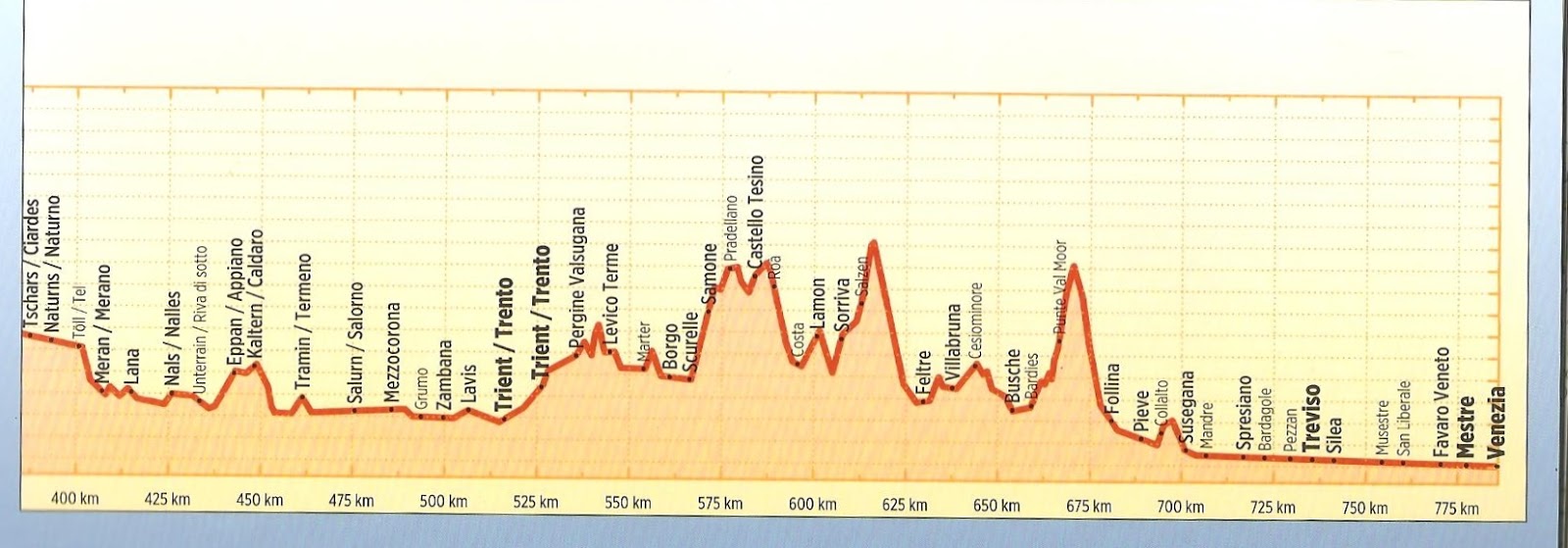 Como acho que já é do conhecimento de todos, a Via Claudia Augusta tem dois ramais, a partir de Trento, na Itália. Um vai a Veneza e outro vai a Ostiglia. Nós escolhemos o primeiro, embora seja o de maior dificuldade por causa das subidas, porque queríamos conhecer Veneza. O mapa do caminho é este: