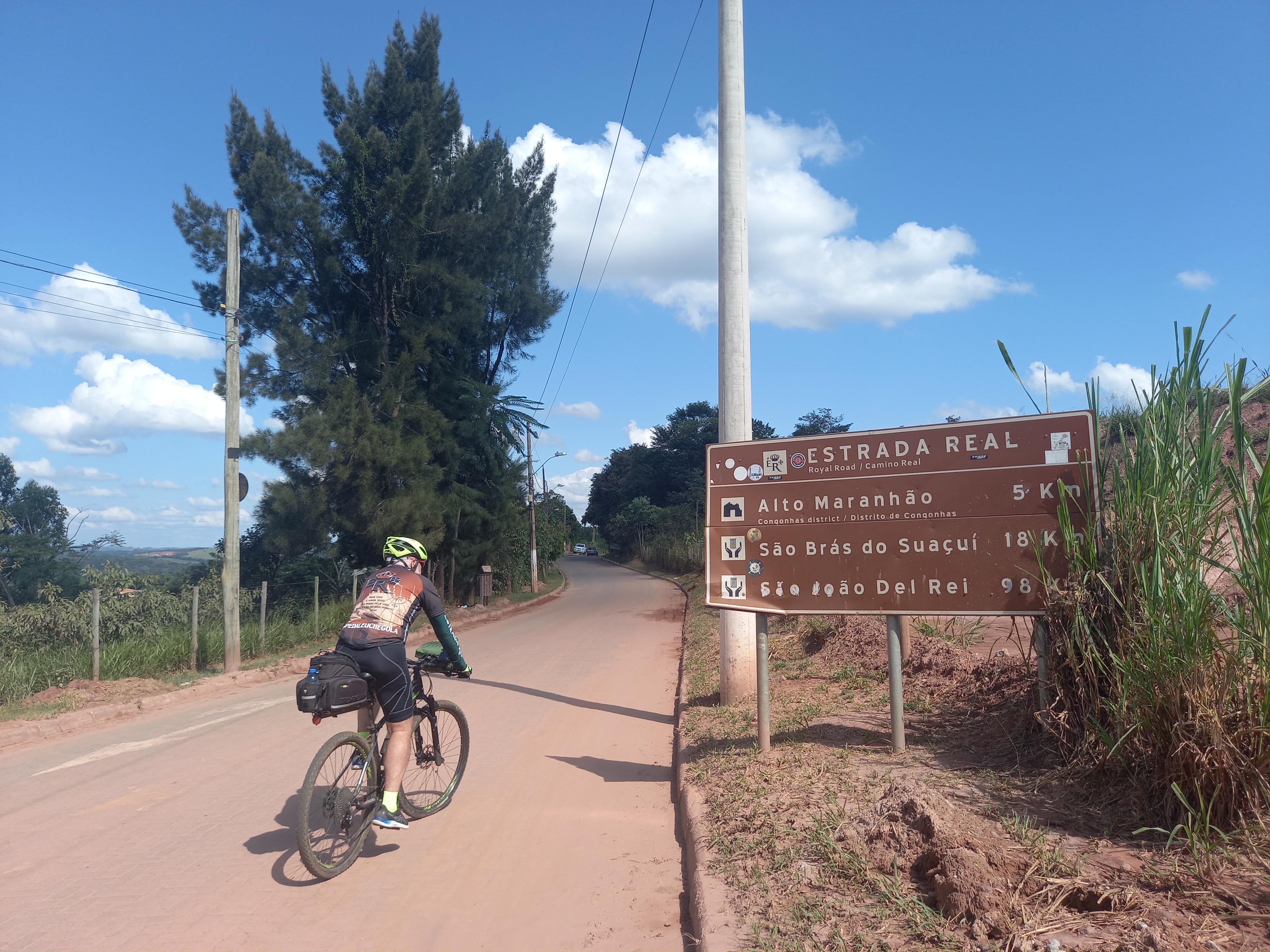Foi necessário atravessar a BR-040, um pouco antes do posto de gasolina, defronte à pousada, porque o caminho que teríamos que seguir fica à esquerda e a estrada tem defensas separando as mãos de direção. O intenso movimento exigiu muito cuidado na travessia e seguimos, depois, uns 200 m no contra fluxo, sob grande risco, já que a via não tem acostamento, para acessar a trilha da passarela que permite passar sobre o rio Maranhão, chegando à estrada de terra existente ao lado da ferrovia, em direção a Congonhas.O trecho, de 5 km, é muito agradável, plano, liso e continua assim mesmo depois que atingimos o asfalto. Só por nos ter livrado do intenso e perigoso tráfego da BR-040 já era uma boa e ainda pedalar com essa tranquilidade, era tudo o que poderíamos desejar.