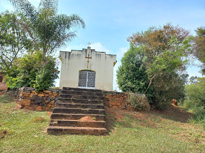 Os cicloturistas, peregrinos e cavaleiros ganharam há pouco tempo mais um caminho de peregrinação em Minas Gerais. Trata-se do Caminho de São Tiago, que une as cidades de Ouro Preto e São Tiago no interior do estado. São 274 km de extensão, sinalizados com 360 totens como esse: Quando bem visíveis, os totens da Estrada Real, solitários e impávidos, indicam silenciosamente a direção a tomar: Antes de chegar à Serra do Camapuã, passamos pela Capela dos Olhos D'Água, dedicada a Nossa Senhora da Lapa, cuja construção se iniciou no século XVII e foi concluída no século XVIII. Como tradicionalmente ocorria naquela época, instala-se o cemitério ao lado da igreja: