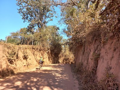 A cidade de Cordislândia não está exatamente no Caminho. Para visitá-la, você tem que pedalar 1 km fora da rota em direção à cidade e depois voltá-lo, para retomar o caminho: Nós não fomos a Cordislândia. Seguimos em direção a Turvolândia, nosso objetivo final de hoje, distante 14 km deste ponto. Se tivéssemos ido a Cordislândia, teríamos cruzado o rio Sapucaí, na ida e na volta. Mas, como não fomos, tivemos que curti-lo à distância: As "janelas do céu" se repetem, sempre espetaculares: Terra batida, marcas da poeira na vegetação, sol e claridade, também são a tônica deste último trecho: