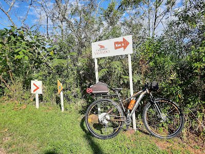 Com muita sombra, o local parece adequado ao que se propõe: meditação. Começamos o pedal às 9:20 h, deixando o local e registrando o marco zero do caminho: