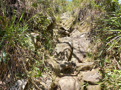 Cerca de 35 minutos depois, novamente mata fechada, sombreada e o "Bosque do Padre Leite": Mais 10 minutos e a vegetação fica mais rala, a estradinha mais delineada e podemos apreciar a beleza e suavidade dos "chuveirinhos": No horizonte, a efígie que dá nome ao local distingue-se recortando o azul do céu: Quase uma hora de caminhada e e chegamos a uma pequena ponte de madeira, onde uma placa referencia a "Trilha do Lobo Guará" e nos mostra que estamos no caminho correto: A pedra da Paciência é um grande afloramento rochoso ao nível do solo. Pareceu-me algo comum, fiquei até um pouco decepcionado. Esperava algo que chamasse mais a atenção. A partir daí a trilha se torna realmente individual e só se ouve o farfalhar dos nossos passos roçando os arbustos e capins: Deparamo-nos, em seguida, 2 minutos depois, com uma cavidade no solo, no qual se fez uma escada rústica para facilitar a subida e a descida. Quando era criança, este tipo de depressão curta e estreita chamávamos de "valo". Diziam-nos que teriam sido feitos por escravos e eram utilizados em épocas remotas para separar propriedades. Mais 10 minutos à frente e já se percebe a configuração rochosa do solo. A vegetação fica mais rala ainda e os arbustos não chegam a se tornar árvores, devido à pouca presença de nutrientes e a existência de enormes pedras aflorando à superfície: